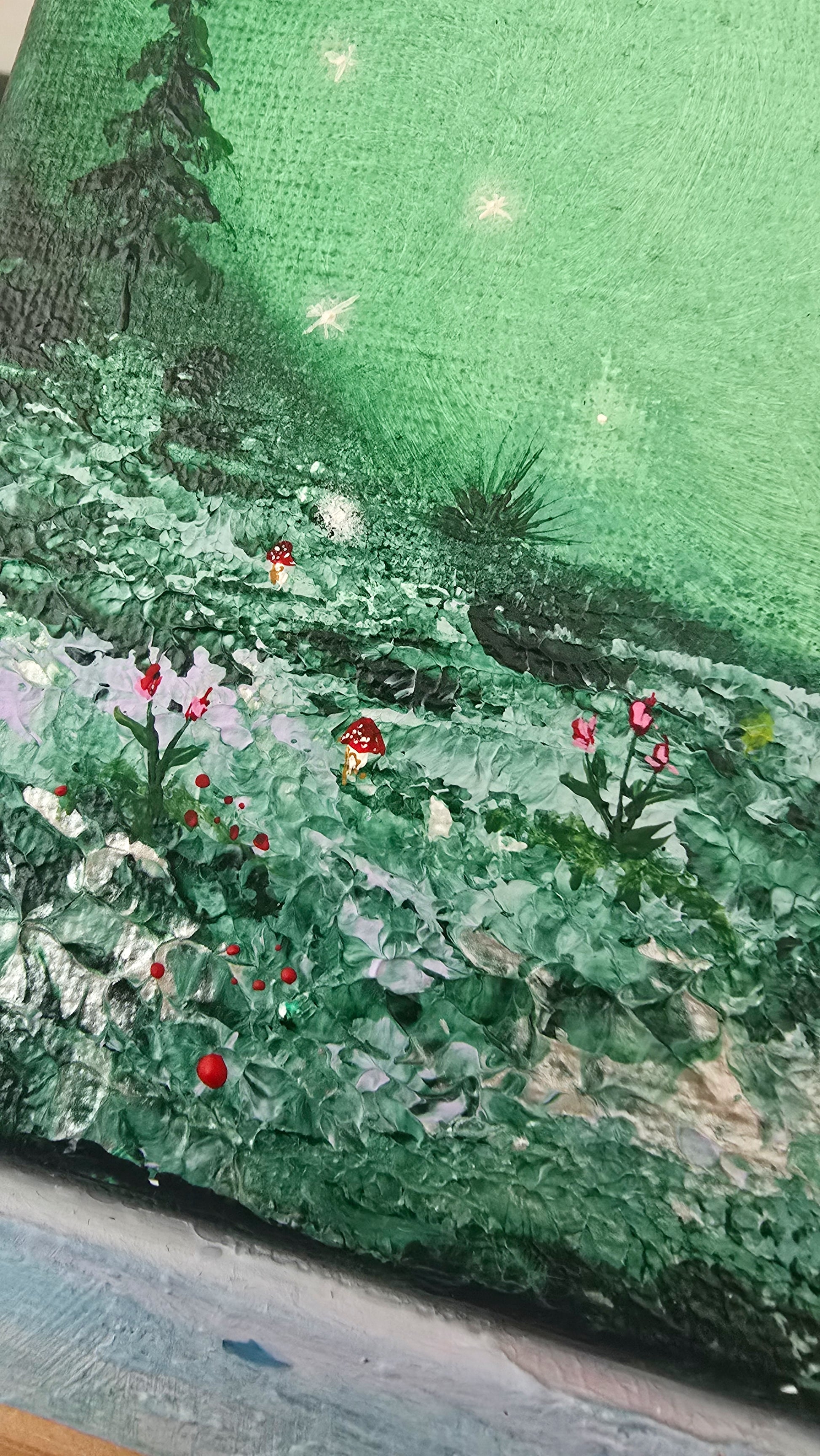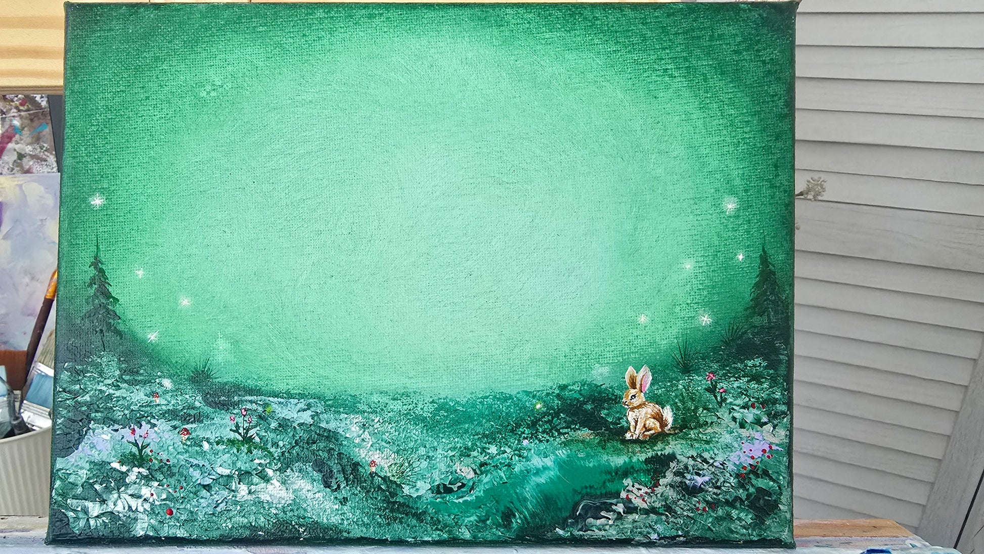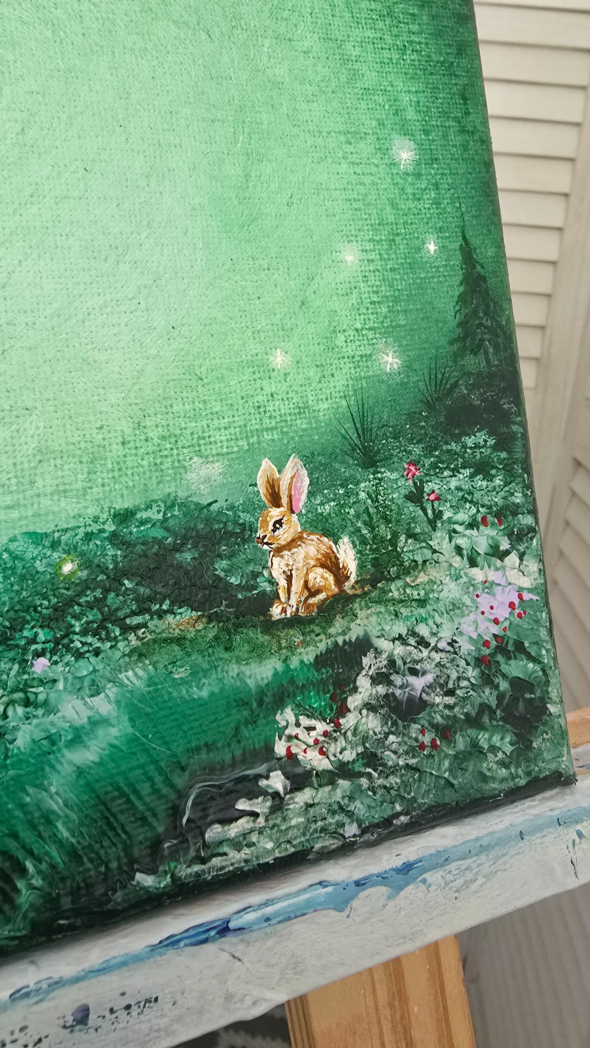 Emerald Bloom is a semi-abstract original painting, 18x24cm, created with acrylic on canvas. This piece invites the viewer into an enchanted world where nature whispers in hues of green and light. At the edge of a glowing field, a small rabbit rests among textured leaves, soft flowers, and twinkling stars - a moment suspended between stillness and magic.