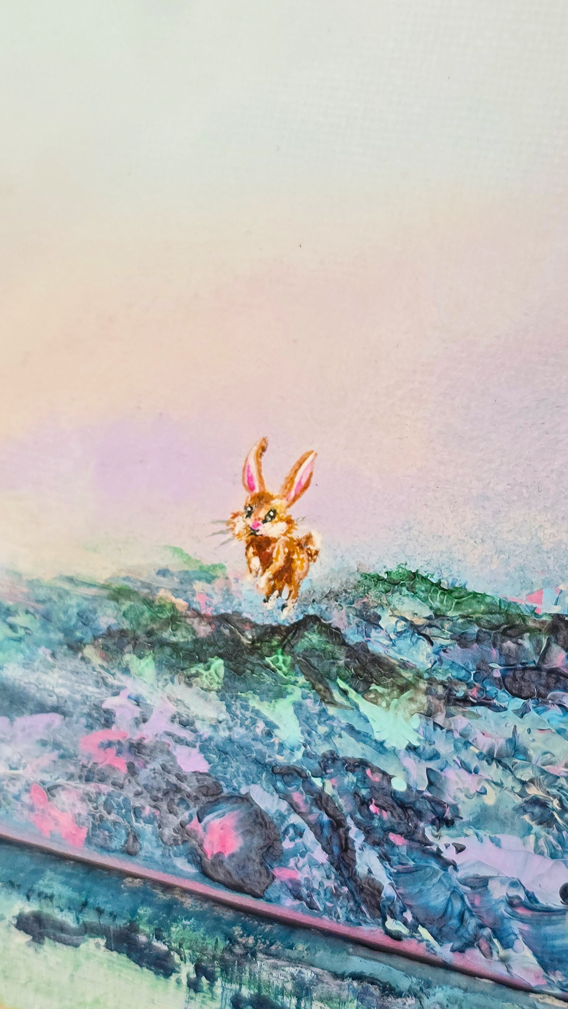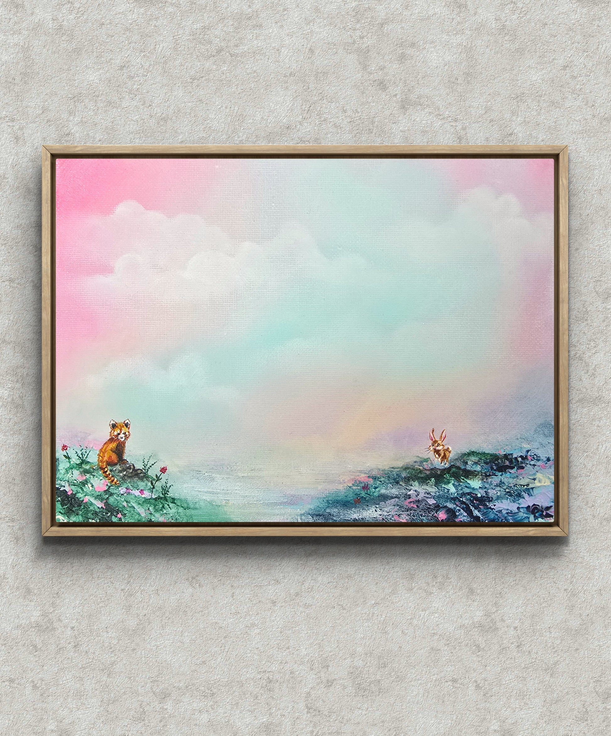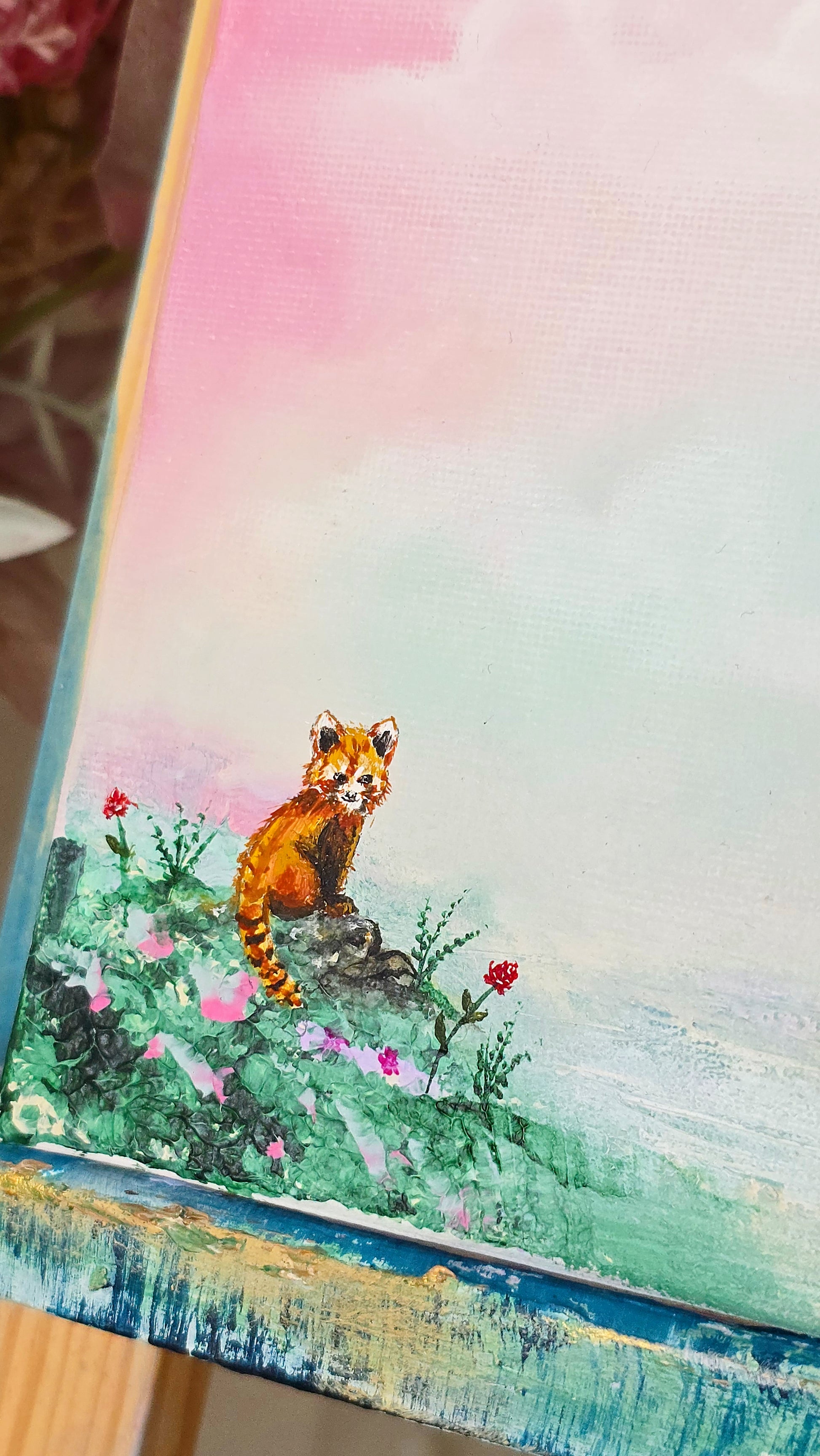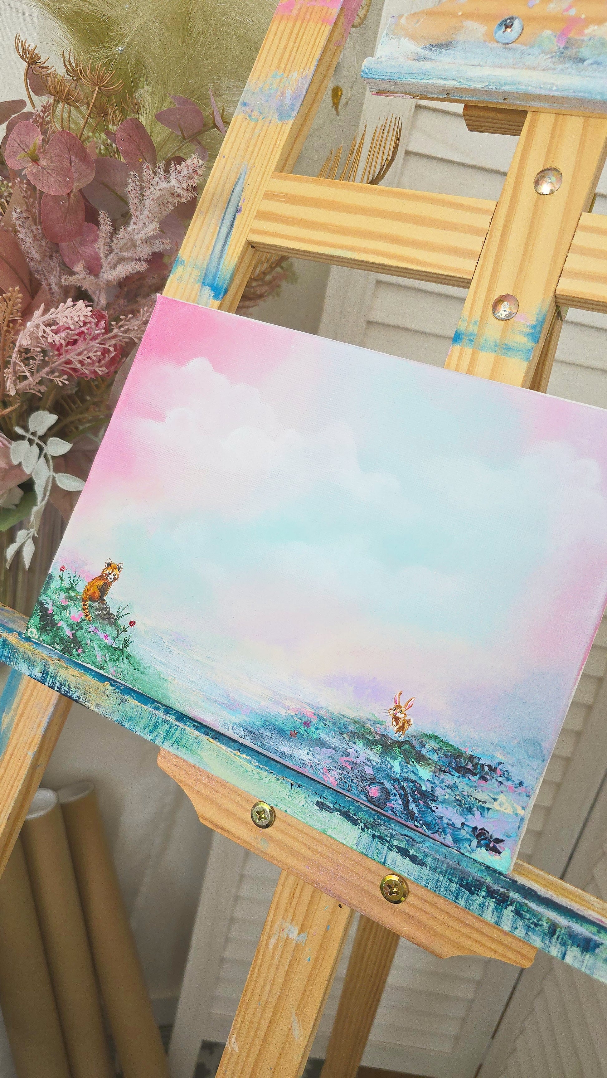 A red panda sits calmly among flowers while a rabbit hops over the fields, both set against soft clouds in the background. The pastel colours on the semi-abstract painting create a dreamlike, mysterious atmosphere, as if these characters exist somewhere between reality and imagination.