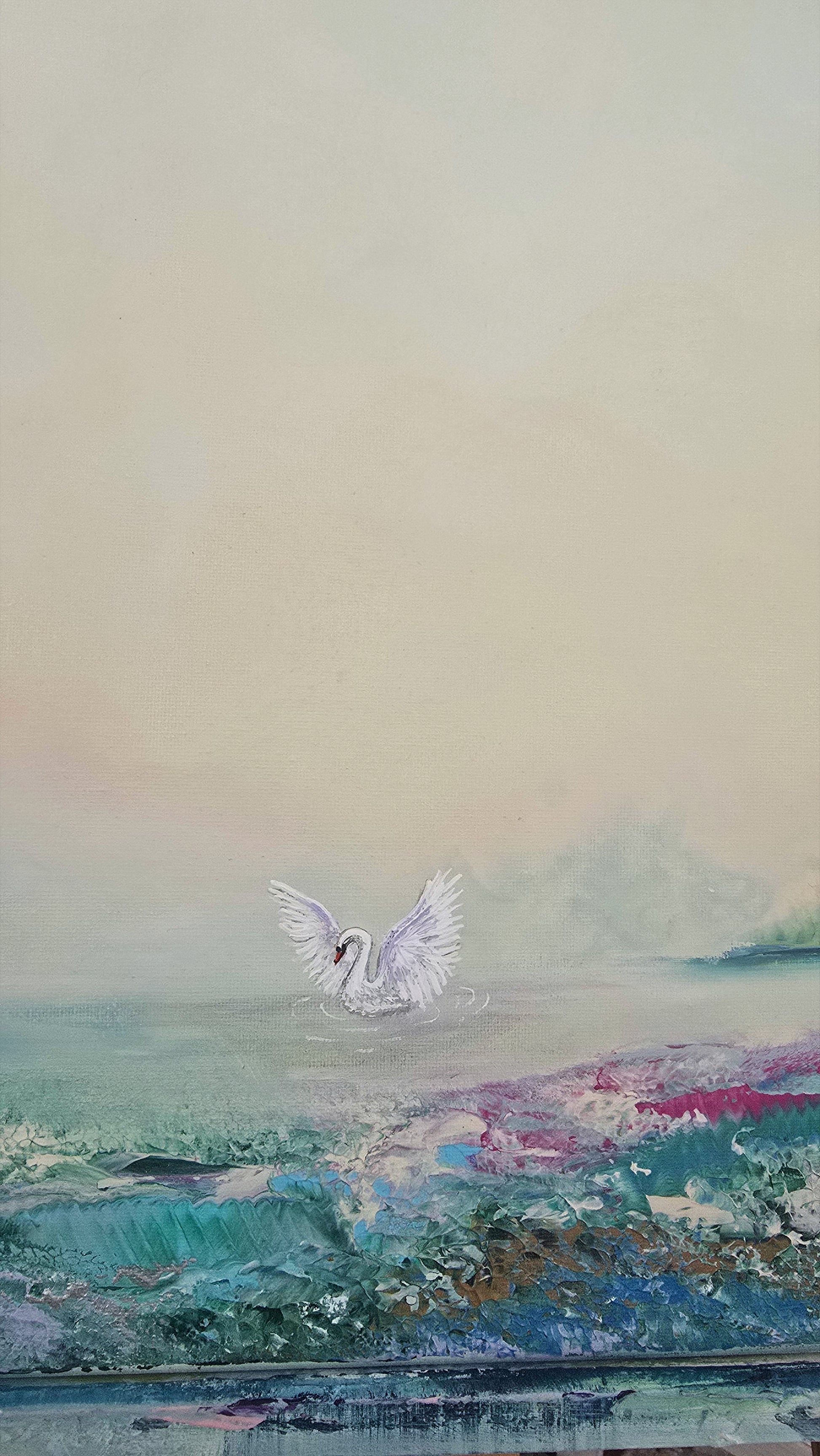 A solitary boat glides through pearlescent mist, its form blending with the water's reflection. Nearby, a heron stands poised its elegant silhouette emerging from layered brushstrokes of milky blues and mineral tones. This semi-abstract work captures the quiet poetry of liminal spaces, where light dances across textured acrylic surfaces reminiscent of quartz's delicate translucency.