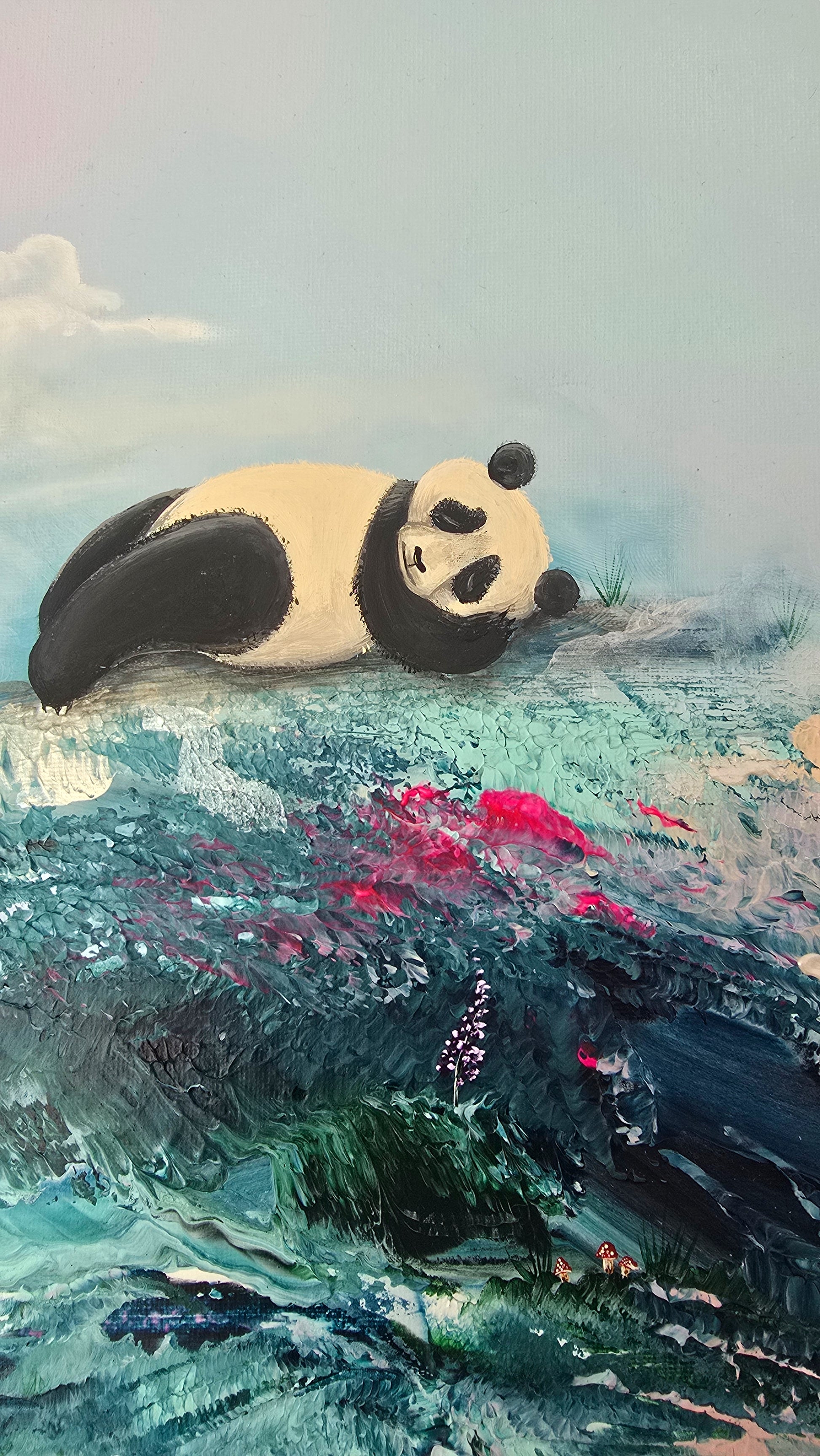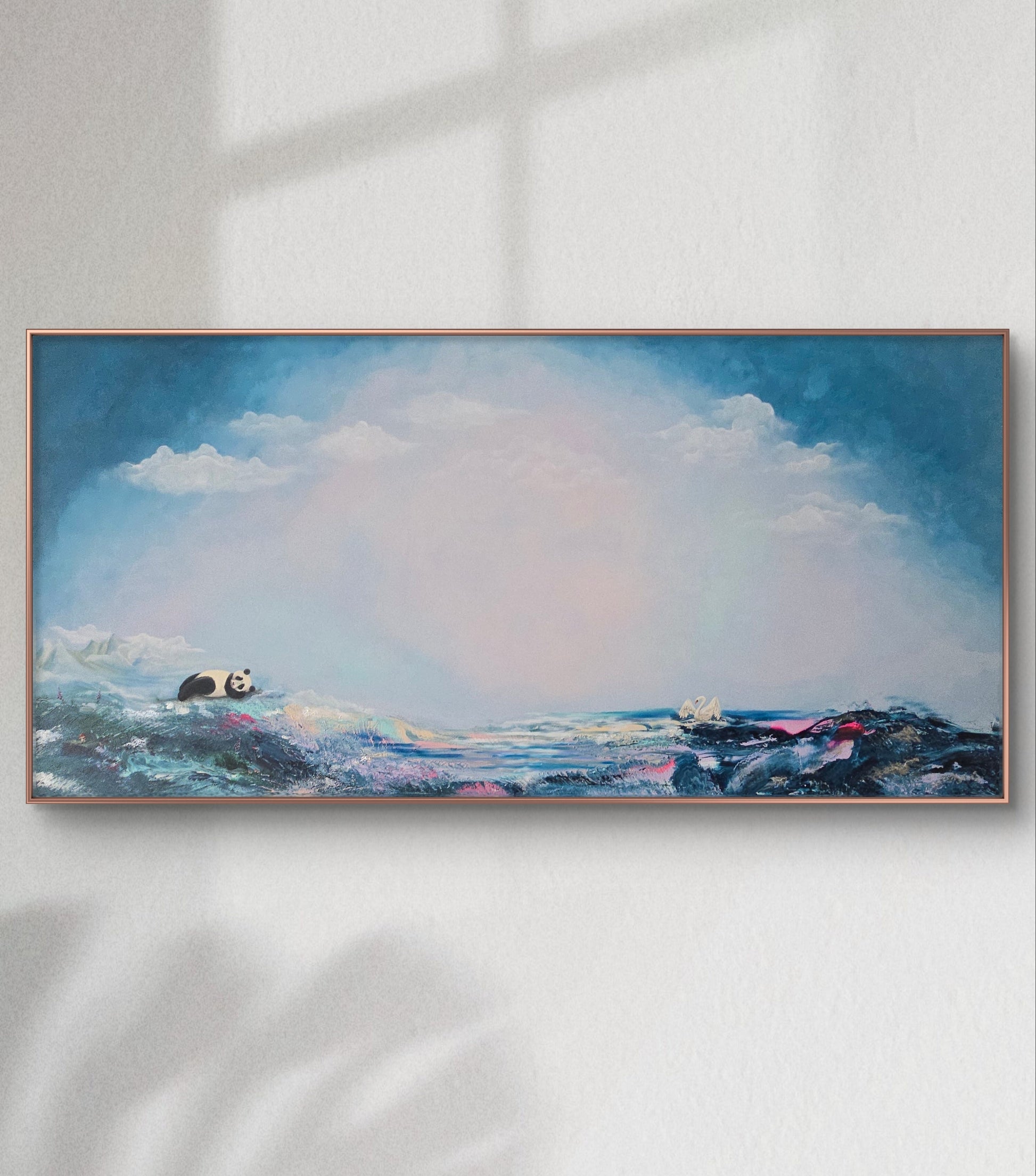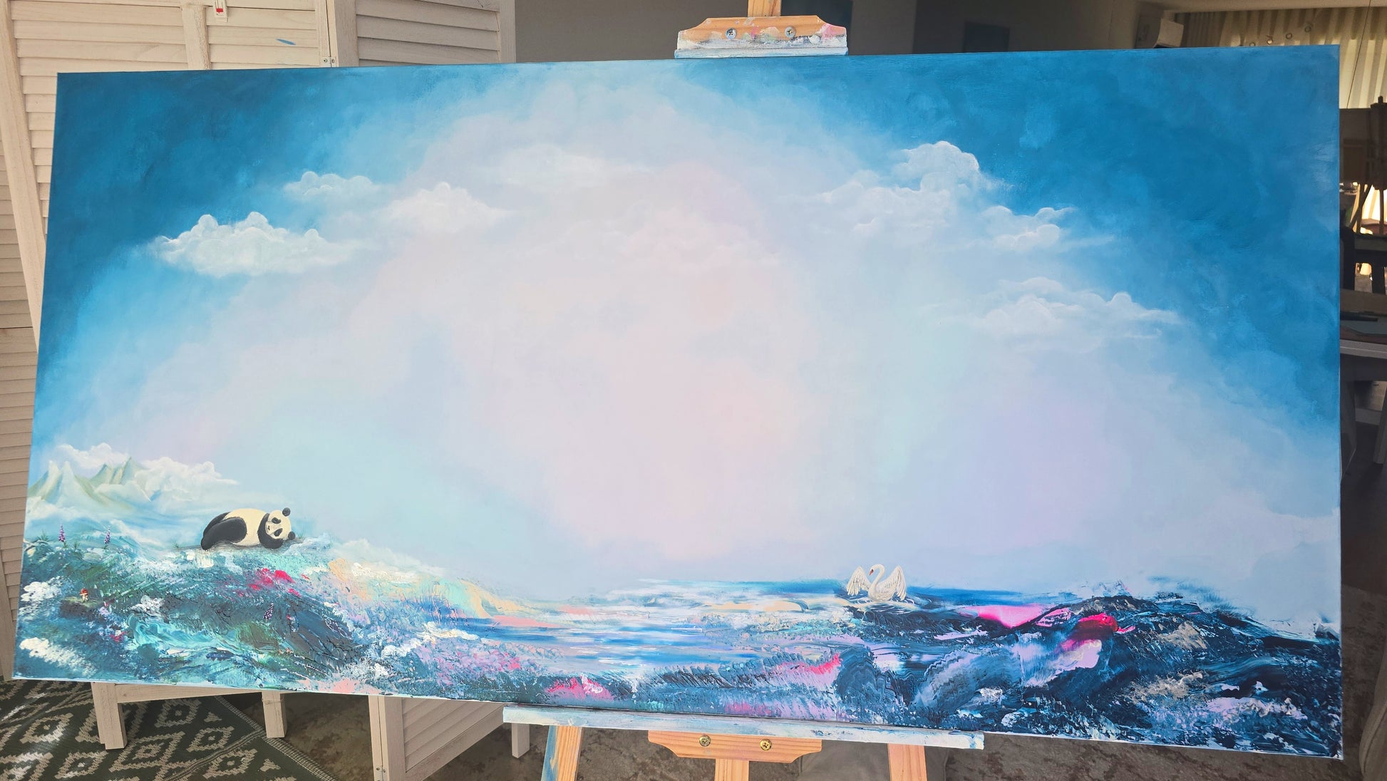 ✨"Somewhere We Meet" is a semiabstract piece created with acrylic and oil pastel on canvas. It evokes a serene landscape where a panda and a distant swan inhabit opposite ends of a dreamlike terrain. Between them stretches a wide expanse of soft blues, quiet textures, and delicate brushwork, inviting reflection on distance, presence, and quiet connection.