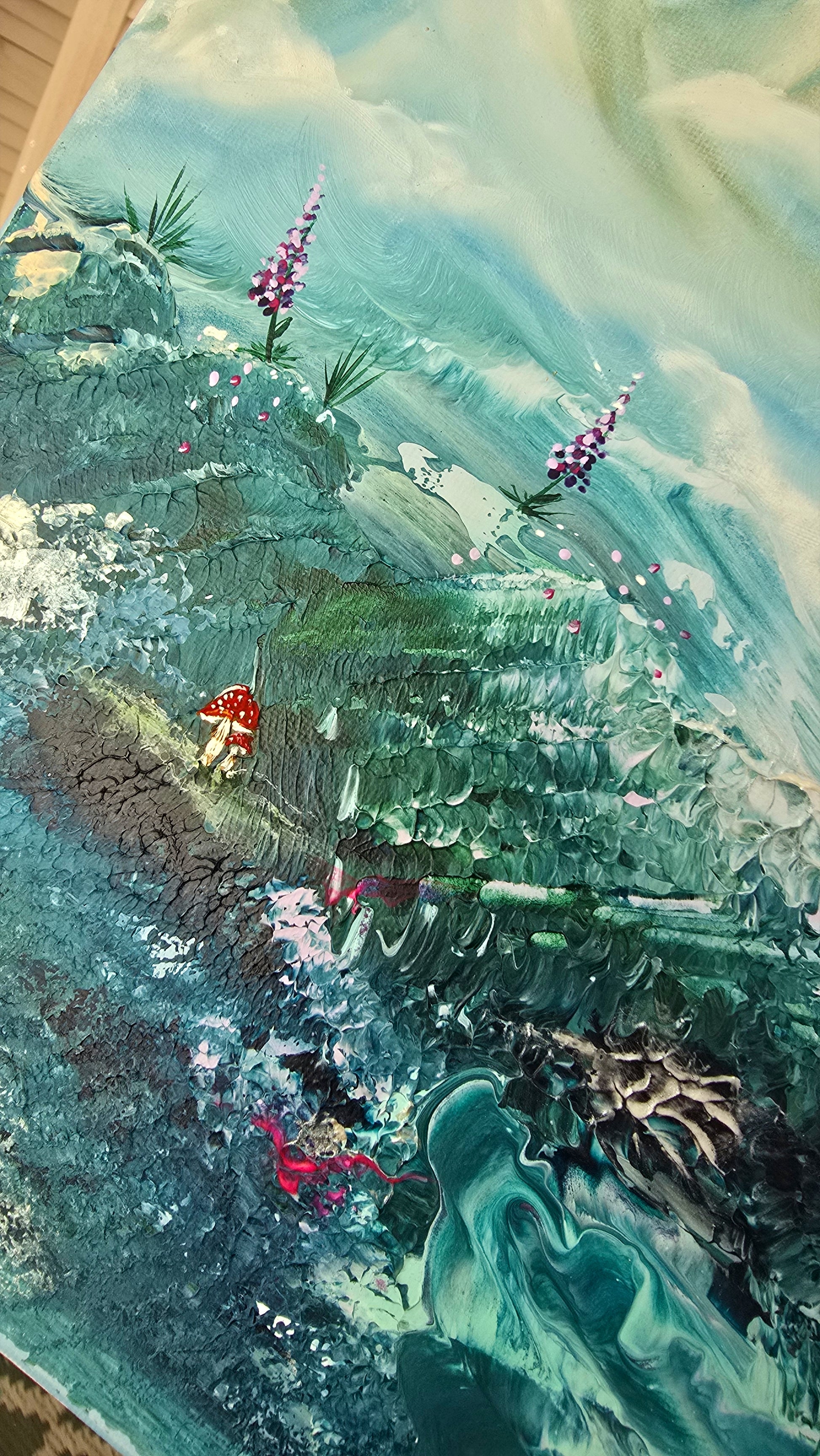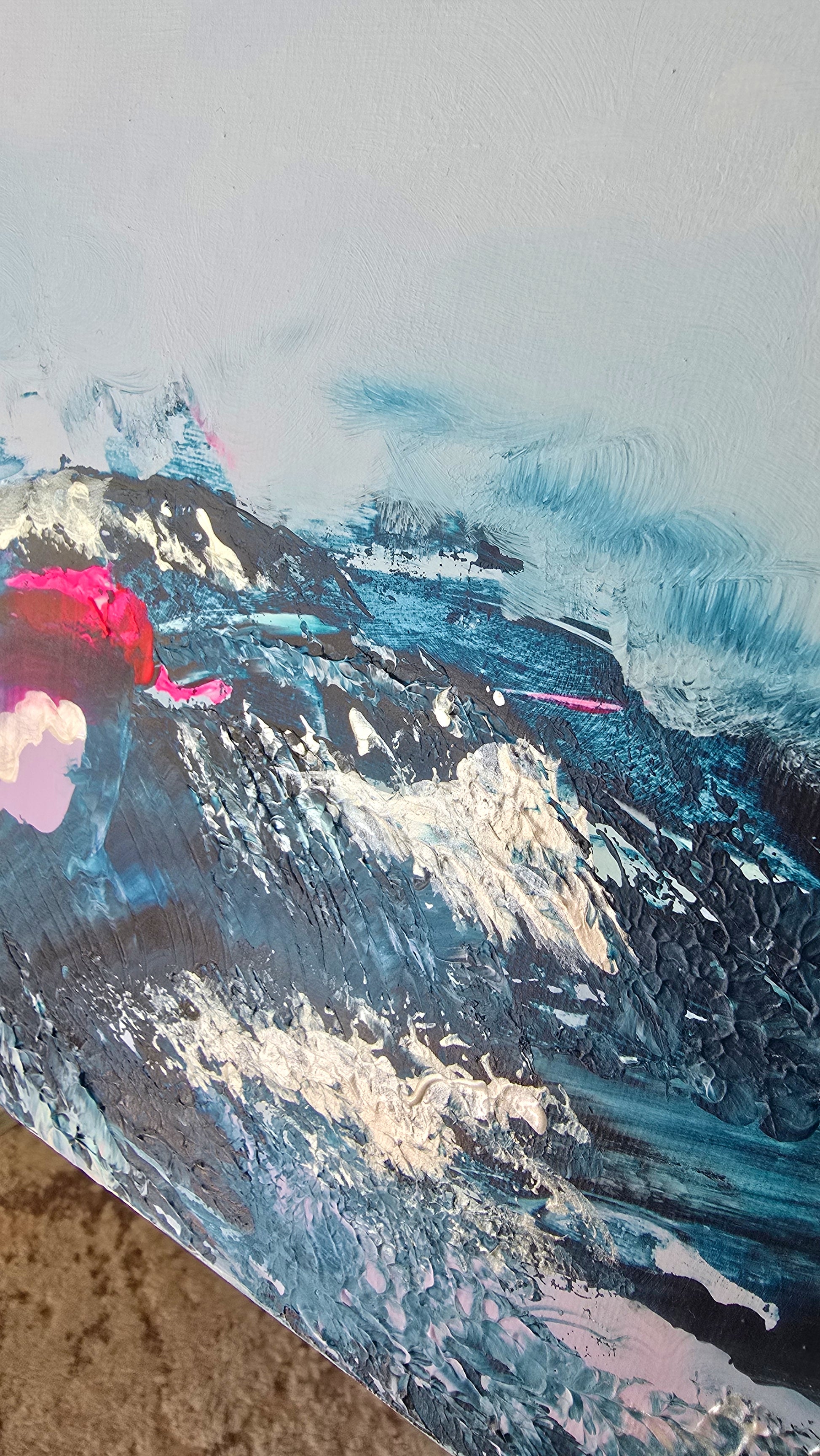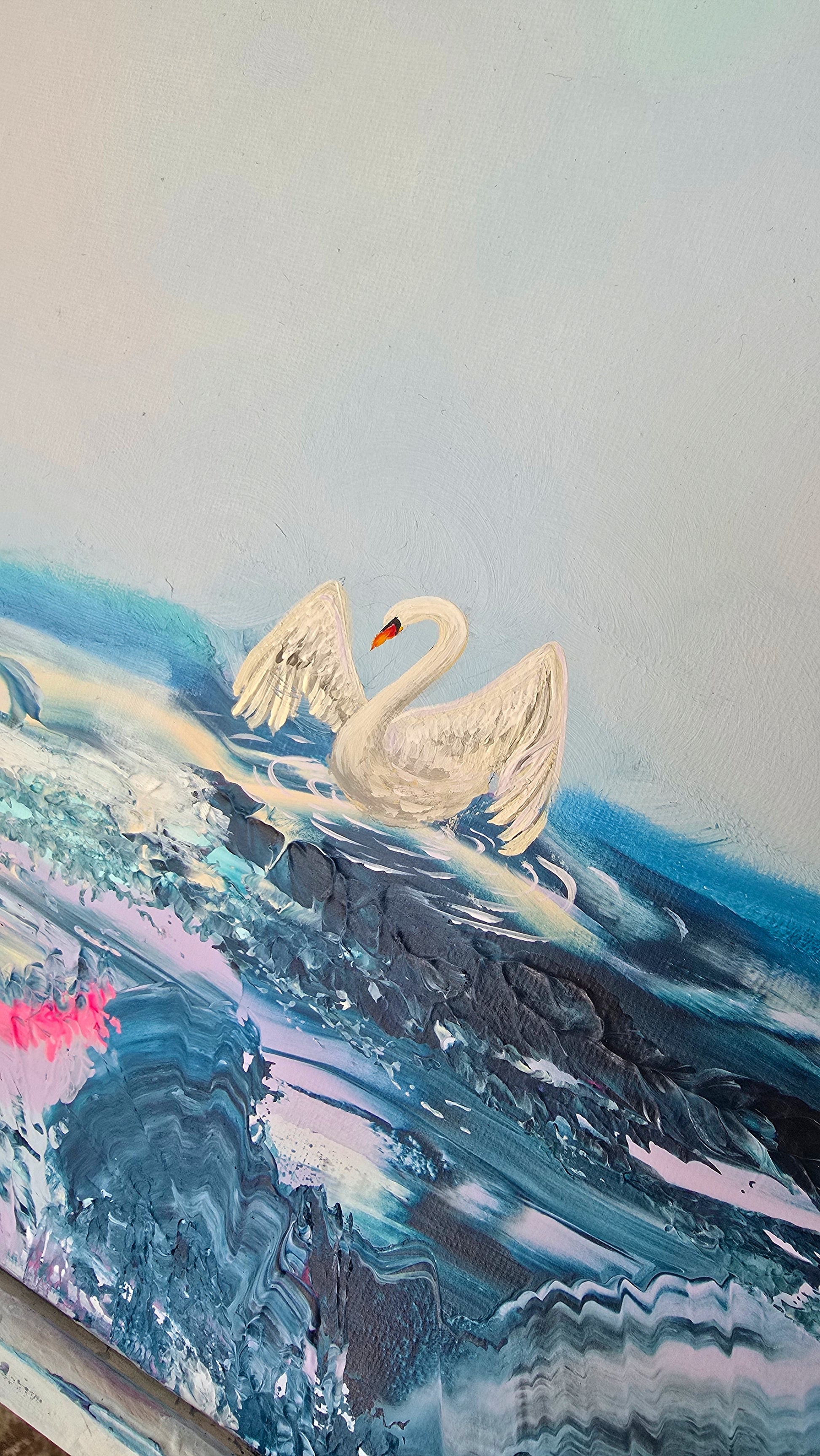 ✨"Somewhere We Meet" is a semiabstract piece created with acrylic and oil pastel on canvas. It evokes a serene landscape where a panda and a distant swan inhabit opposite ends of a dreamlike terrain. Between them stretches a wide expanse of soft blues, quiet textures, and delicate brushwork, inviting reflection on distance, presence, and quiet connection.