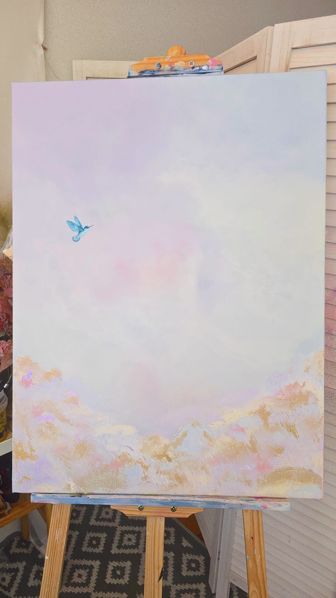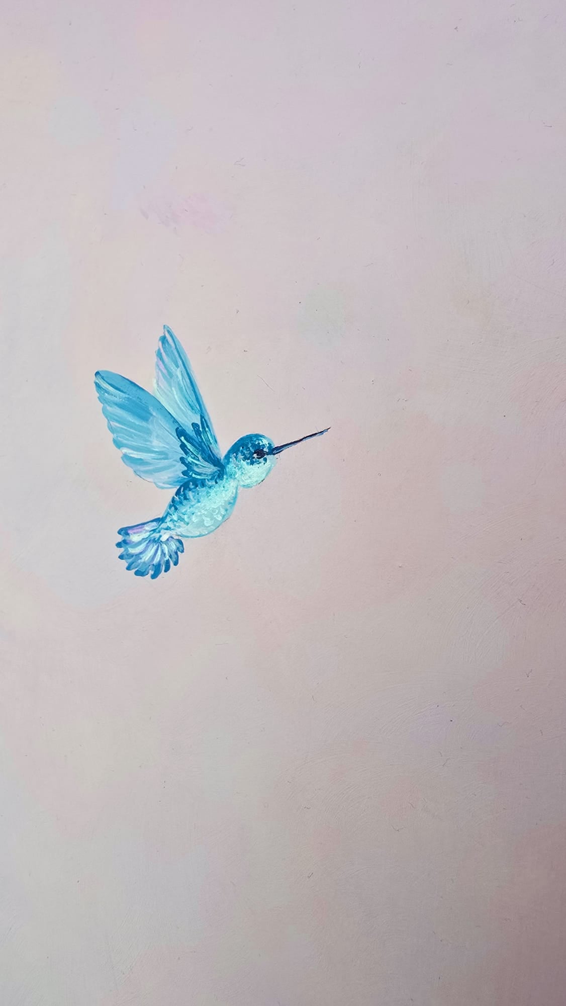 At the heart of this piece, the hummingbird emerges as a symbol of freedom, presence, and subtle energy. It is gently highlighted using pearl paints, adding a soft shimmer that catches the light and mimics the bird’s natural iridescence. This delicate touch brings the hummingbird to life, giving it a glowing, almost dreamlike quality that shifts as the light changes.