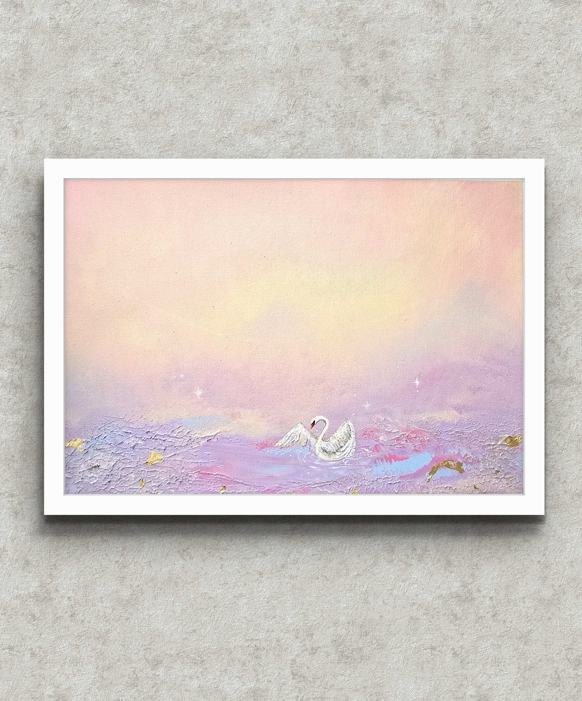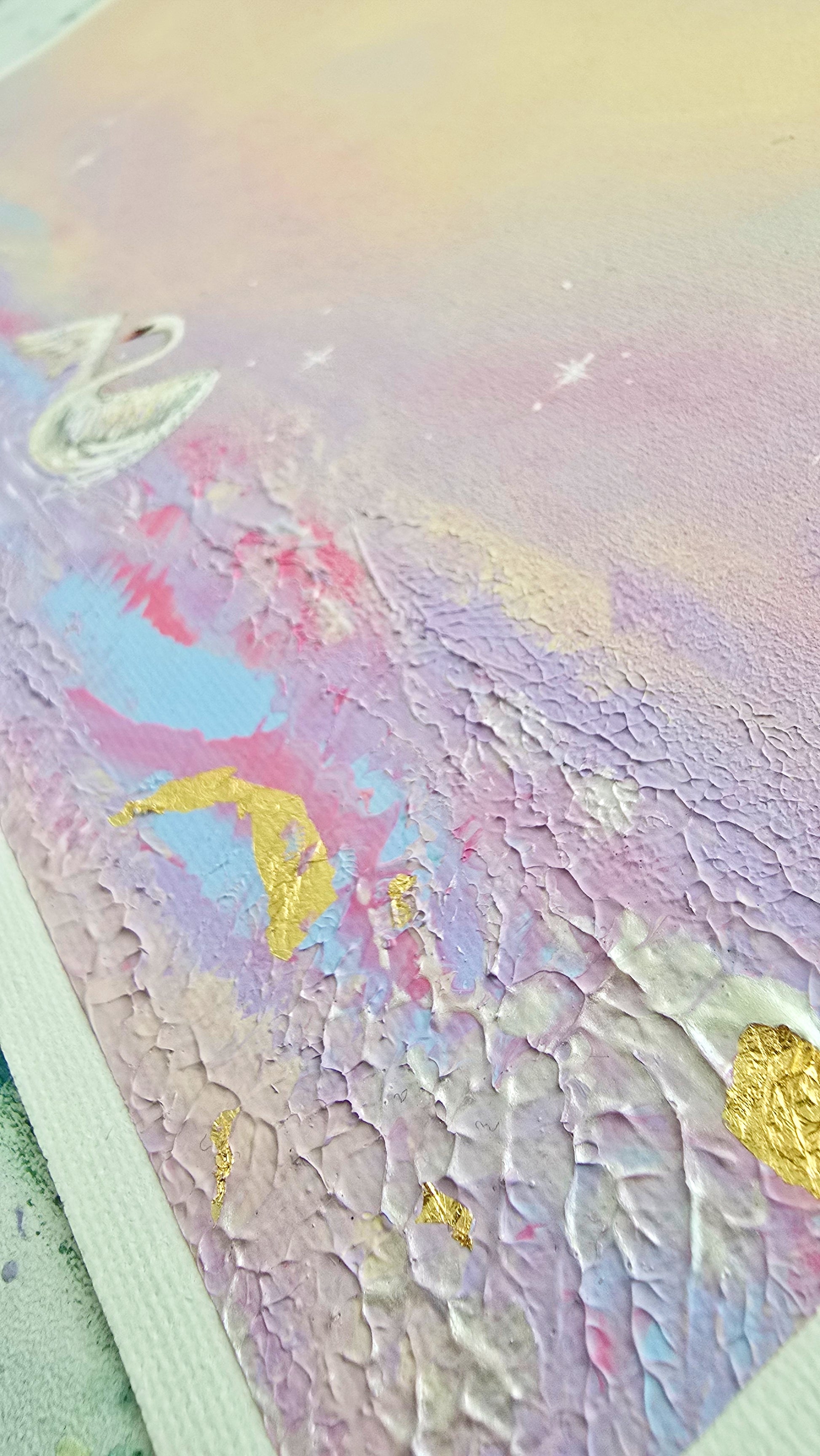 The Swans Waltz is a semi-abstract acrylic painting that captures the elegant movement of a single swan gliding gracefully across calm waters. With fluid brushstrokes and soft colours, the piece evokes a serene and poetic atmosphere, blending realism with dreamy abstraction.