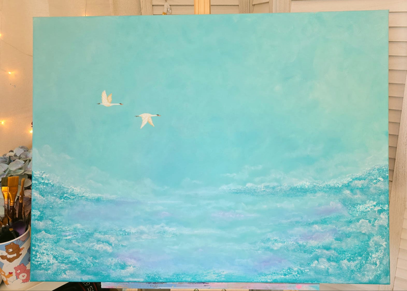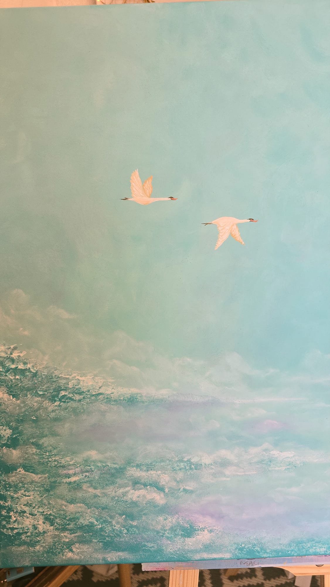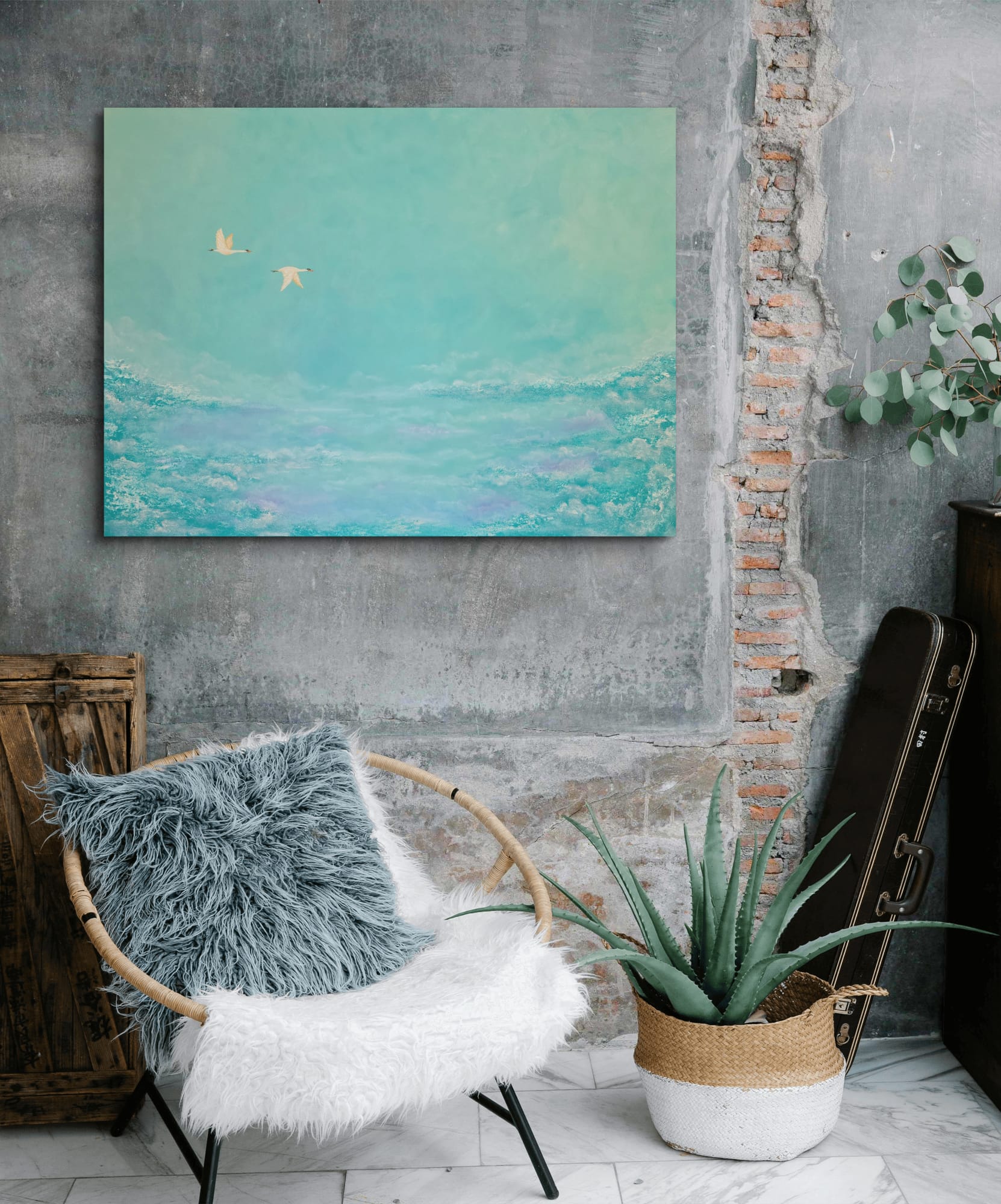 A semi-abstract piece that invites calm, stillness, and reflection. Soft shades of teal and white form an ethereal horizon, where two swans in mid-flight appear as symbols of grace, freedom, and quiet connection.