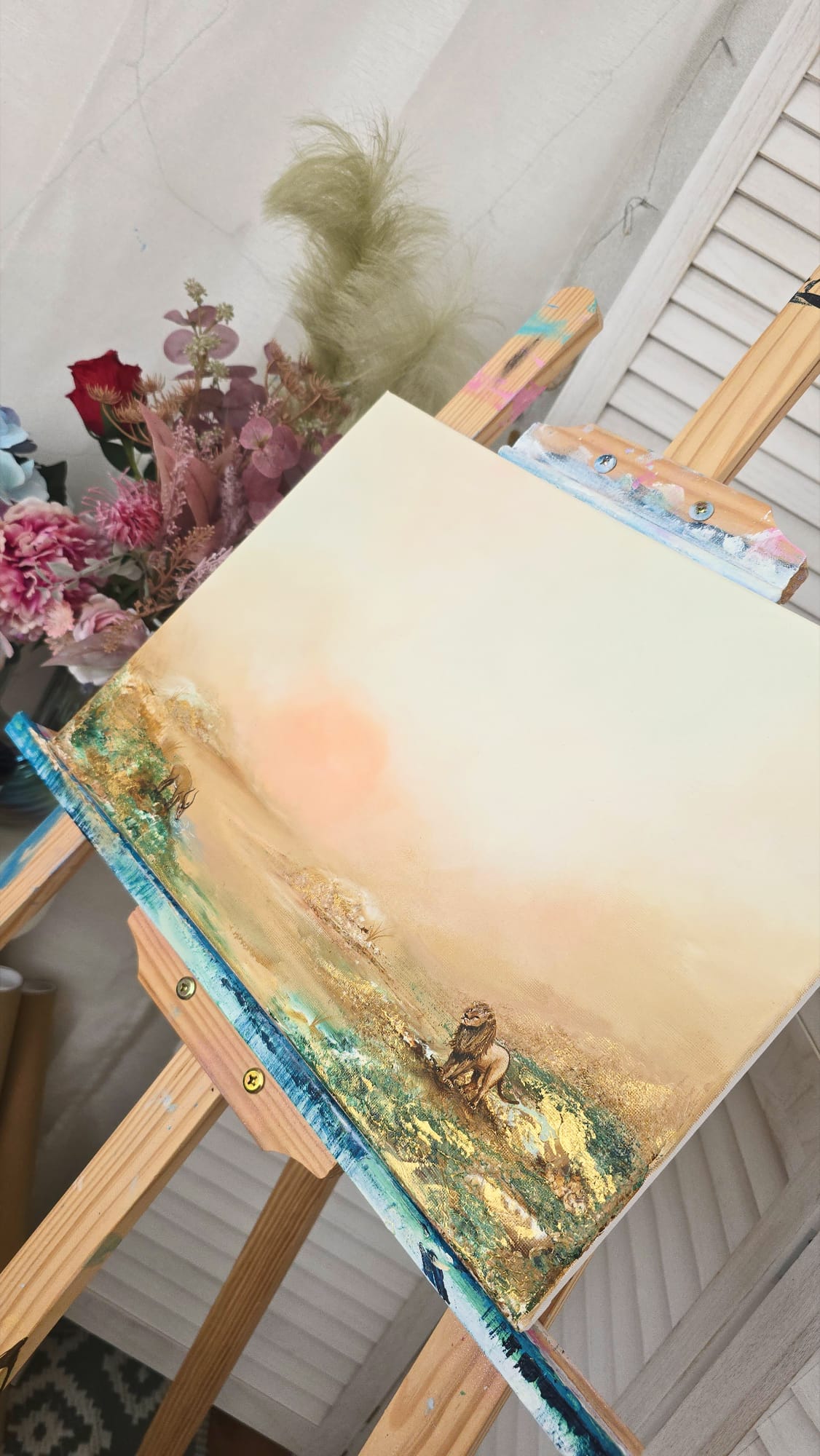 "Wild Majesty" was inspired by the African savannah and that quiet tension between a lion and an antelope - both strong in their own way, just existing in the same golden space. The brushstrokes are soft and airy, and the warm colours bring a calm sense of movement and balance.